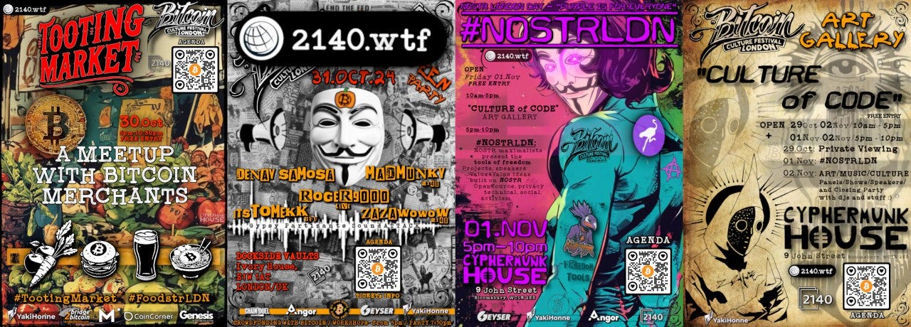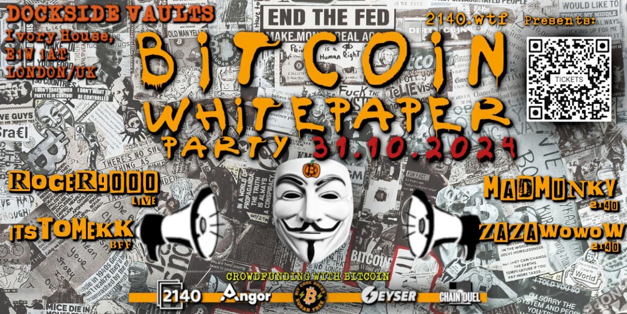 Bitcoin Whitepaper Party: Celebrate Bitcoin’s 16th birthday on Bitcoin Whitepaper Day at the Dockside Vaults this Halloween. Loads happening starting from 17:30 including:
